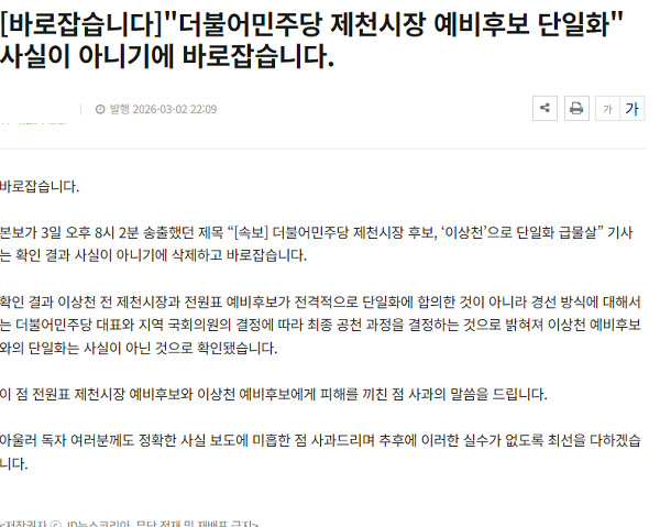 Àü¿øÇ¥ ¿¹ºñÈ帴 ±ÝÀÏ(3ÀÏ) º¸µµÀڷḦ ÅëÇØ 2ÀÏ ¹ã ÇÑ ¸Åü°¡ º¸µµÇÑ "¹ÎÁÖ´ç Á¦Ãµ½ÃÀå Èĺ¸ ÀÌ»óõÀ¸·Î ´ÜÀÏÈ ±Þ¹°»ì"À̶ó´Â ±â»ç¿¡ ´ëÇØ ¡°´Ü¾ðÄÁ´ë ¸í¹éÇÑ ÇãÀ§ÀÌÀÚ °ÅÁþ¡±À̶ó¸ç, ¡°´Ü¼ø ½Ç¼ö°¡ ¾Æ´Ñ Ä¡¹ÐÇÏ°Ô ±âȹµÈ Á¤Ä¡Àû À½¸ðÀÏ °¡´É¼ºÀ» ¹èÁ¦ÇÒ ¼ö ¾ø´Ù¡±¸ç,¹ýÀû Á¶Ä¡¿¡ ³ª¼°Ú´Ù´Â ¶æÀ» ¹àÇû´Ù.