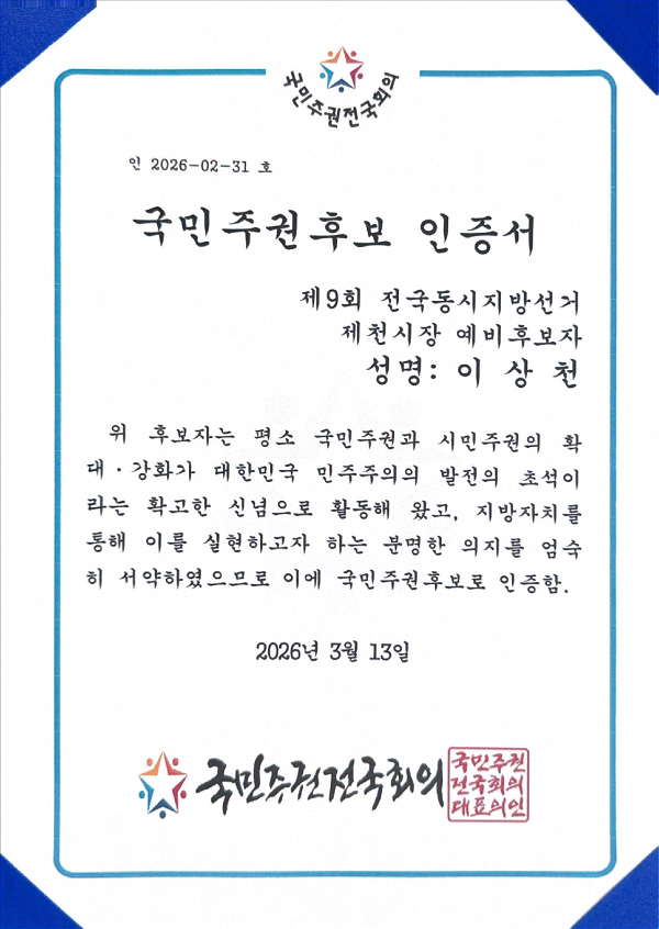 2026³â Á¦9ȸ Àü±¹µ¿½ÃÁö¹æ¼±°Å¸¦ ¾ÕµÎ°í ±¹¹ÎÁÖ±ÇÀü±¹È¸Àǰ¡ ÀÌ»óõ Á¦Ãµ½ÃÀå ¿¹ºñÈ常¦ ¡®±¹¹ÎÁÖ±ÇÈĺ¸¡¯·Î °ø½Ä ÀÎÁõÇß´Ù.