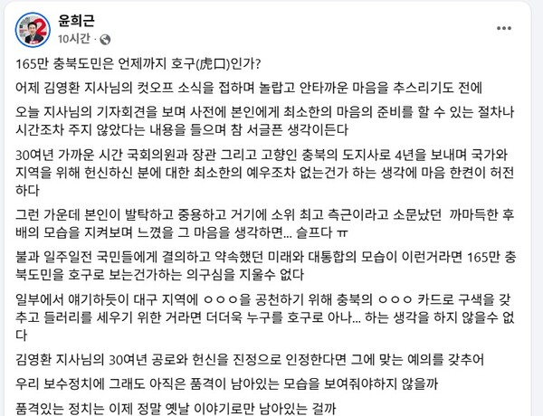 Á¶ Àü ½ÃÀåÀÇ »çÅð¿¡ À̾î À±Èñ±Ù Àü °æÂûûÀåµµ ±ÝÀÏ(18ÀÏ) ¿ÀÀü 7½Ã °æ ÀÚ½ÅÀÇ ÆäÀ̽ººÏÀ» ÅëÇØ "ºÒ¸éÀÇ ¹ãÀ» º¸³»¸ç ÀÏüÀÇ ¼±°Å¿îµ¿À» Áß´ÜÇÏ°í ¼÷°íÀÇ ½Ã°£À» °®°Ú´Ù"¸ç ¼±°Å¿îµ¿ Áß´Ü Àǻ縦 ¹àÇû´Ù.