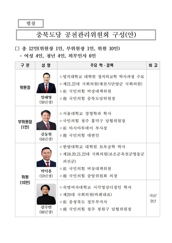 ±ÝÀÏ(26ÀÏ) ±¹¹ÎÀÇÈû ÃæºÏµµ´çÀÌ °øÃµ°ü¸®À§¿øÈ¸ ±¸¼ºÀ» ¸¶¹«¸®Çϰí 12¸íÀÇ °ø°üÀ§¿ø ¸í´ÜÀ» ¹ßÇ¥Çß´Ù.¾öÅ¿µ ÃæºÏµµ´ç °ø°üÀ§¿øÀåÀº ¡°À̹ø Áö¹æ¼±°Å´Â ÃæºÏÀÇ À§»óÀ» À硦