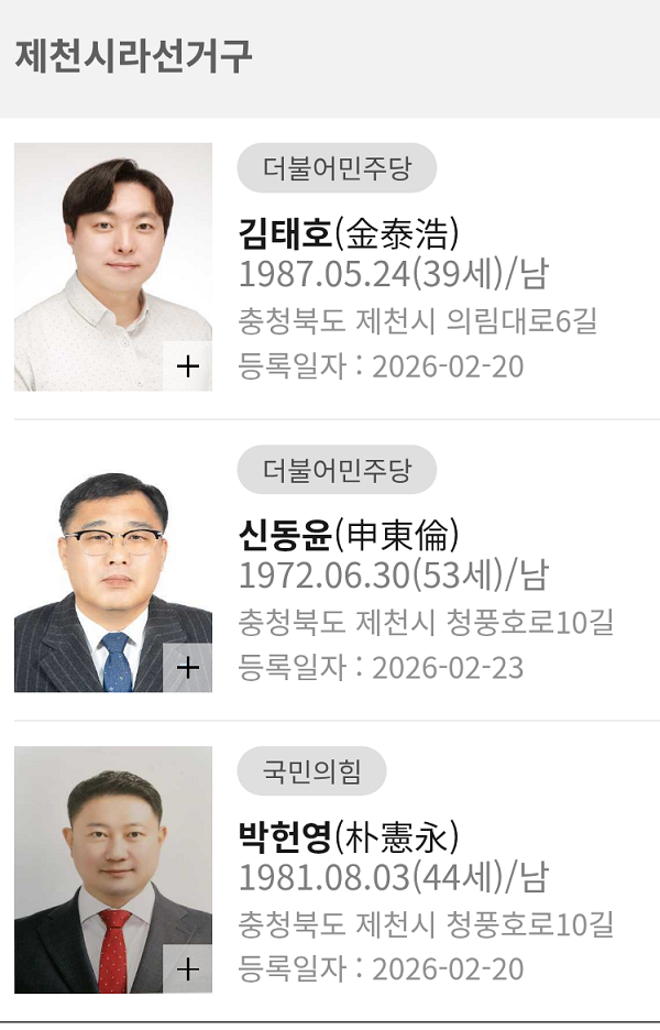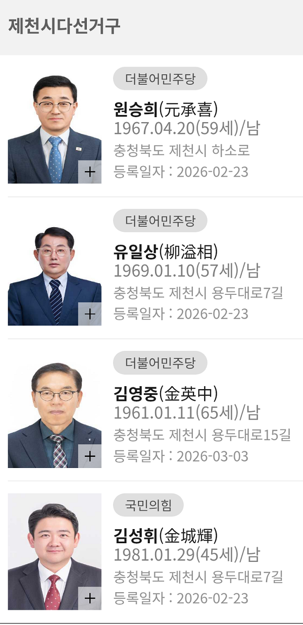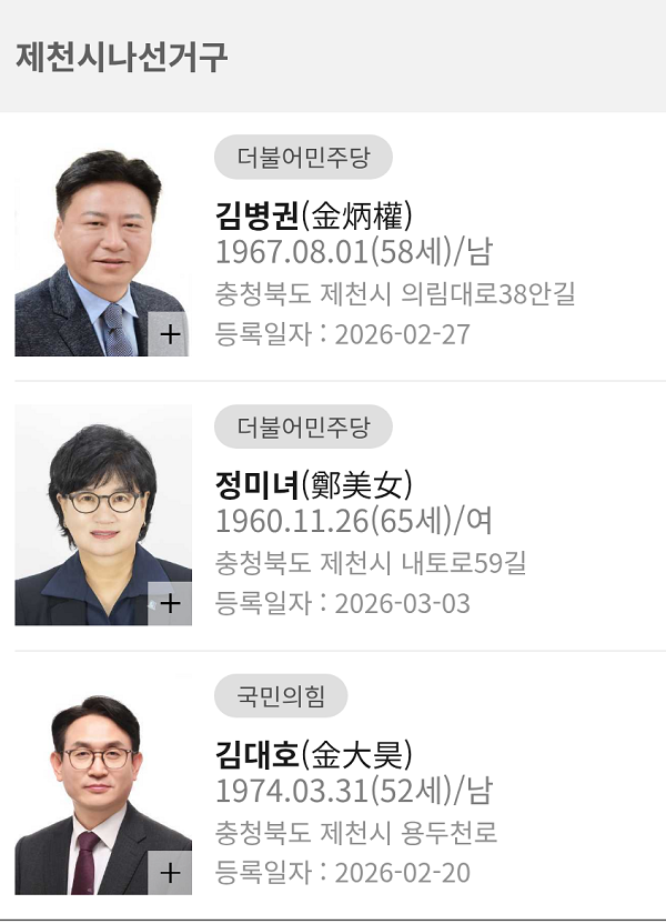 2026.3.7ÀÏ ÇöÀç Á¦Ãµ½Ã ±âÃÊÀÇ¿ø ¿¹ºñÈ帷Π15¸íÀÌ µî·ÏÀ» ¸¶ÃÆ´Ù.(ÁÖÀºÃ¶ ±âÀÚ) ³ª¼±°Å±¸¿¡¼­´Â ±¹¹ÎÀÇÈû ÀÌÁ¤ÀÓ ÀÇ¿ø°ú ±èÁøÈ¯ ÀÇ¿øÀÌ È¸±â°¡ ³¡³ª´Â ´ë·Î ¿¹ºñÈĺ¸ µî¡¦