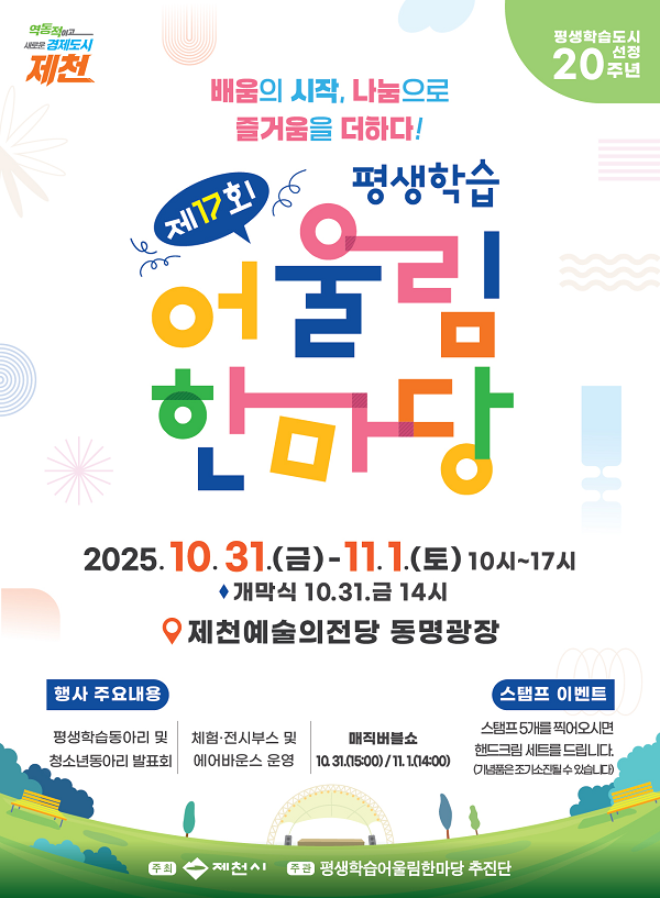Á¦Ãµ½Ã´Â ½Ã¹Î ¸ðµÎ°¡ ÇÔ²² ¹è¿ì°í ¼ºÀåÇÏ´Â Æò»ýÇнÀ¹®È È®»êÀ» À§ÇØ ¡®Á¦17ȸ Æò»ýÇнÀ ¾î¿ï¸²ÇѸ¶´ç¡¯À» 10¿ù 31ÀϺÎÅÍ 11¿ù 1ÀϱîÁö Á¦Ãµ µ¿¸í±¤Àå ÀÏ¿ø¿¡¼ °³ÃÖÇÑ´Ù°í ¹àÇû´Ù.