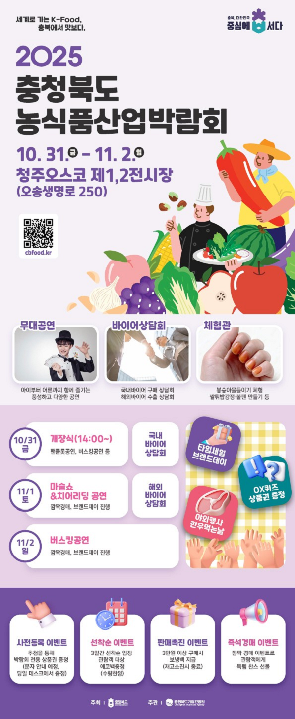 ÃæºÏµµ´Â µµ³» ³ó½Äǰ »ê¾÷ÀÇ ¿ì¼ö¼º°ú °æÀï·ÂÀ» ³Î¸® ¾Ë¸®°í, Áö¿ª ³ó°¡ ¹× ½Äǰ±â¾÷ÀÇ ÆÇ·Î È®´ë¸¦ À§ÇÑ ¡®Á¦1ȸ ÃæÃ»ºÏµµ ³ó½Äǰ»ê¾÷ ¹Ú¶÷ȸ¡¯°¡ 10¿ù 31ÀÏ °³Àå½ÄÀ» ½ÃÀÛÀ¸·Î 11¿ù 2ÀÏ(ÀÏ)±îÁö 3Àϰ£, ûÁÖ¿À½ºÄÚ¿¡¼ ¿¸°´Ù°í ¹àÇû´Ù.