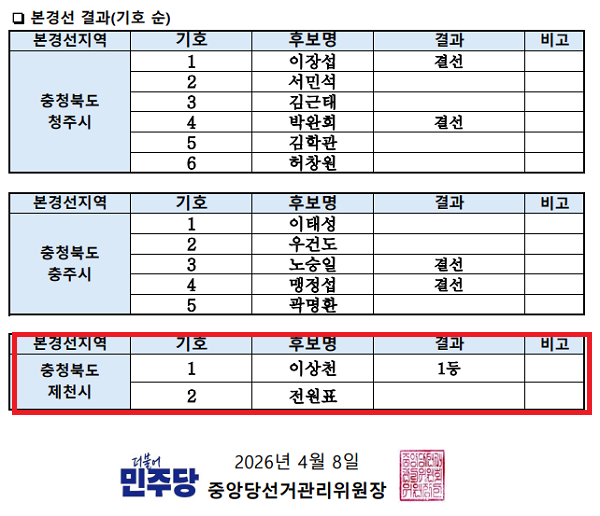 ±¹¹ÎÀÇÈû Á¦Ãµ½ÃÀå Èĺ¸ ¼±ÃâÀ» À§ÇÑ °æ¼±¹æ½ÄÀÌ 13ÀÏ(±ÝÀÏ) ÃÖÁ¾ È®Á¤ ¹ßÇ¥µÆ´Ù.±¹¹ÎÀÇÈû ÃæºÏµµ´ç °øÃµ°ü¸®À§¿øÈ¸´Â 12ÀÏ Á¦7Â÷ °ø°üȸ¸¦ ¿­°í Á¦Ãµ½ÃÀå Èĺ¸ ¼±Ãâ°ú °ü¡¦