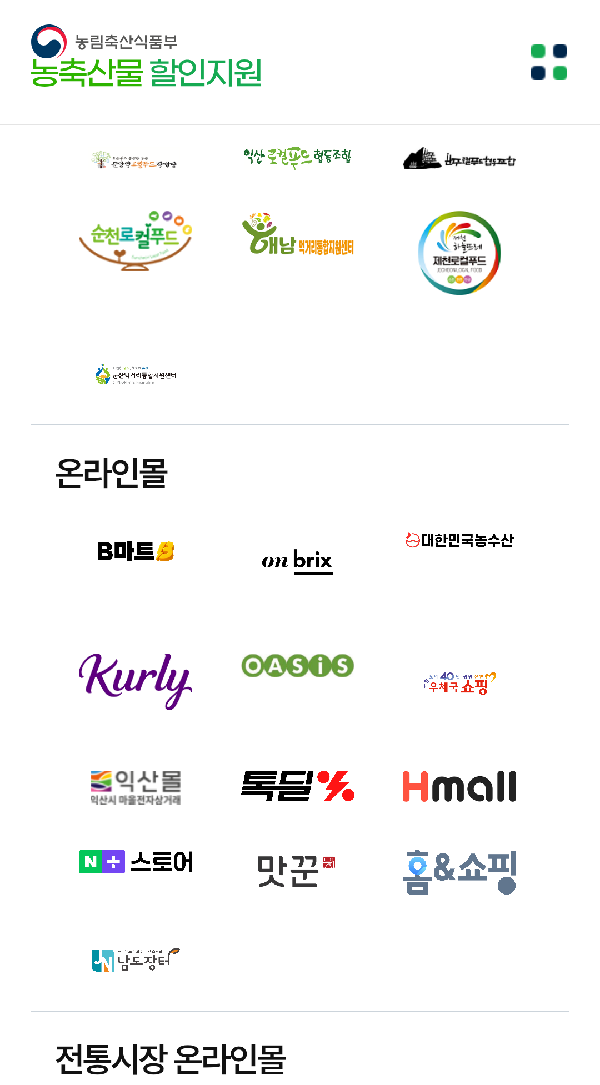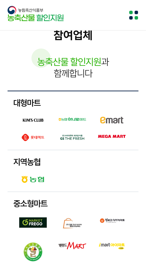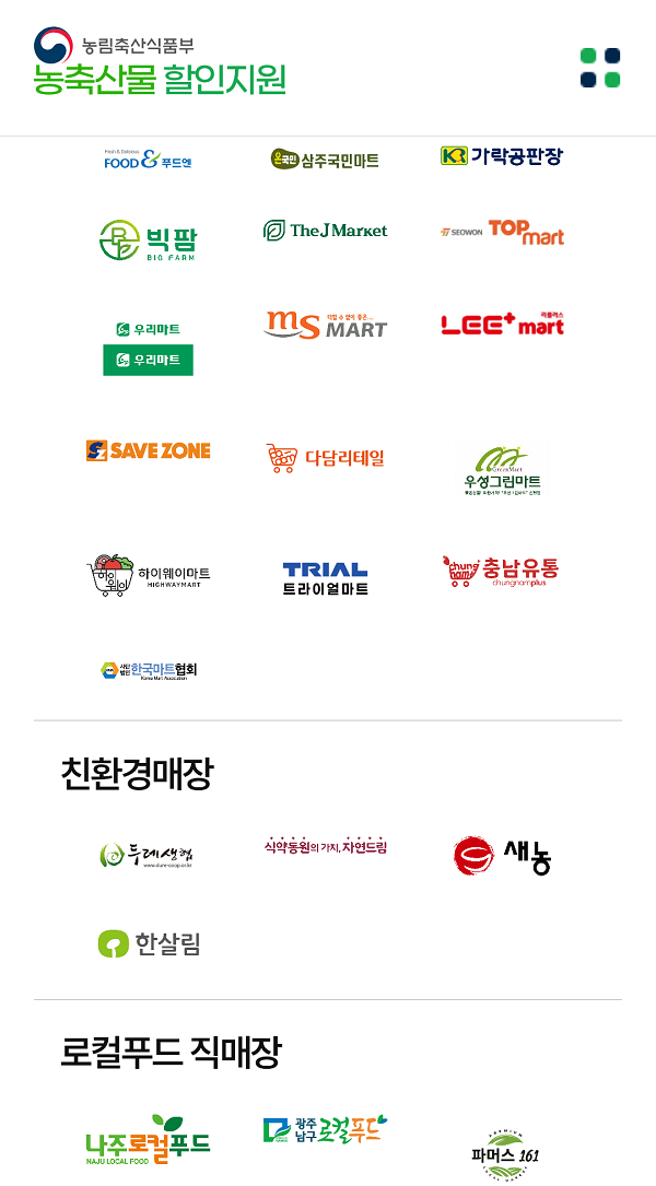 °¡°ø½Äǰ ¿Ü¿¡ ½Å¼± ³óÃà»ê¹°¿¡ ´ëÇØ¼µµ º°µµÀÇ ÇÒÀÎ Áö¿øÀÌ ÀÌ·ïÁø´Ù.ÇÑ¿ì´Â 2¿ù 15ÀϱîÁö ÃÖ´ë 50%À» ÇÒÀÎÇÏ´Â ¼ÒÇÁ¶óÀÌÁî Çà»ç°¡ ÆîÃÄÁö¸ç,»ç°ú, ¹è µî 13°³ ǰ¸ñ¿¡ ´ëÇØ¼´Â 2¿ù 16ÀϱîÁö ÃÖ´ë 40% ÇÒÀÎ Áö¿øÀÌ ÀÌ·ïÁø´Ù.ÀüÅë½ÃÀå¿¡¼ ±¹»ê ³óÃà»ê¹° ±¸¸Å ½Ã 30% ÇÒÀÎÀ» ¹ÞÀ» ¼ö ÀÖ´Â ´ëÇѹα¹ ³óÇÒ»óǰ±ÇÀ» ¹ßÇà ÁßÀÌ´Ù.½Ç½Ã°£À¸·Î º¯µ¿µÇ´Â »ó¼¼ ÇÒÀΠǰ¸ñÀº ³óÃà»ê¹° ÇÒÀÎÁö¿ø ´©¸®Áý(sale.foodnuri.go.kr/)¿¡¼ È®ÀÎÇÒ ¼ö ÀÖÀ¸¸ç,³ó¸²Ãà»ê½ÄǰºÎ ³óÃà»ê¹° ÇÒÀÎÁö¿ø °í°´¼¾ÅÍ 1644-1797¹øÀ¸·Î ¹®ÀÇÇÏ¸é µÈ´Ù.