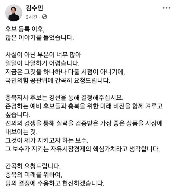Ãß°¡ °øÃµÀ» ½ÅûÇÑ ±è¼ö¹Î Àü ºÎÁö»çµµ 18ÀÏ ÀÚ½ÅÀÇ SNS¸¦ ÅëÇØ °ø°üÀ§¿¡ °æ¼±À» ¿äûÇß´Ù.