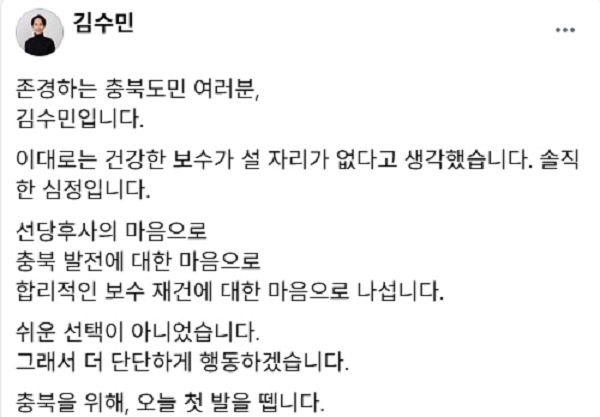 ±è¼ö¹Î Àü ÃæÃ»ºÏµµ Á¤¹«ºÎÁö»ç°¡ ±¹¹ÎÀÇÈû ÃæºÏÁö»ç Èĺ¸ Ãß°¡ °ø¸ð¿¡ ÀÀ¸ðÇϸ鼭 ÃæºÏÁö»ç ¼±°ÅÆÇÀÌ ¿äµ¿Ä¡°í ÀÖ´Ù.±¹¹ÎÀÇÈû ÃæºÏµµ´ç¿¡ µû¸£¸é ±è¼ö¹Î ûÁֽà û¿ø±¸ ´ç¡¦